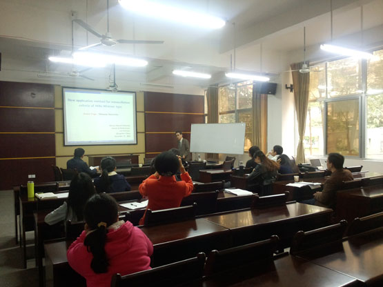 在《A new application method for hille-wintner type nonoscillation criteria》中,Jitsuro Sugie教授主要从Sturm-Liouville非振动线性微分方程背景进行介绍,并从扩展Hille-Wintner非振动线性微分方程的应用领域的主要结论进行了详细地讲解。在《A fractional approach to boxicity of graphs》中,Akita Kamibeppu博士对目前研究的成果以及接下来着手研究的内容进行了详细地讲解。报告结束后,在座的老师和学生就这些研究问题进行了探讨和交流。