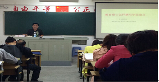 教育硕士作了题为《教育硕士怎样撰写毕业论文》的报告,报告由周仕荣教授主持。