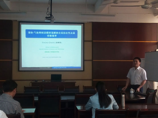 报告会上,张教授主要从液体-气体两相流模型的研究背景、研究问题、主要研究结果以及未来研究方向四个方面进行了介绍,在场师生受益匪浅。
