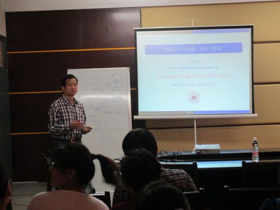 应我系邀请,6月20日,中山大学博士生导师赵育林教授在砺志楼114会议室作了一场《Hilbert 十六问题:历史与现状》的学术报告,相关老师和部分研究生聆听了此次报告,报告由副主任蔡建平教授主持。