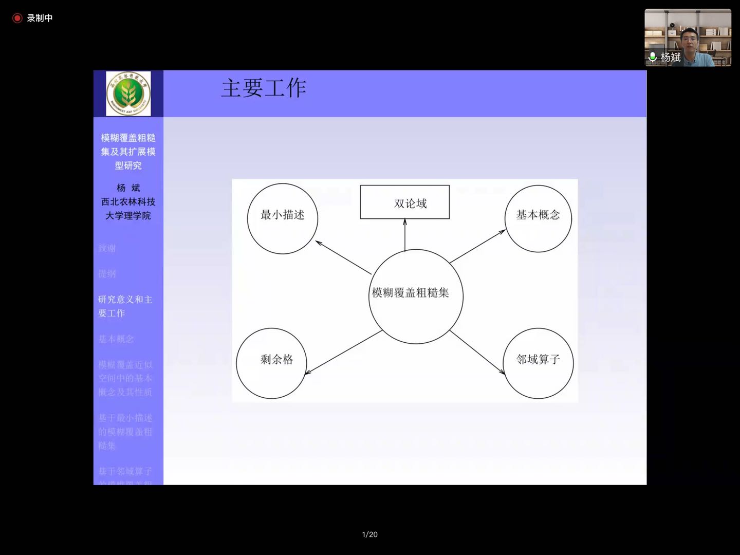 邀请,10月20日下午,西北农林科技大学杨斌副教授在腾讯会议作了题为《模糊覆盖粗糙集及其扩展模型研究》的报告。相关师生聆听了此次报告,报告由林艺东博士主持。
