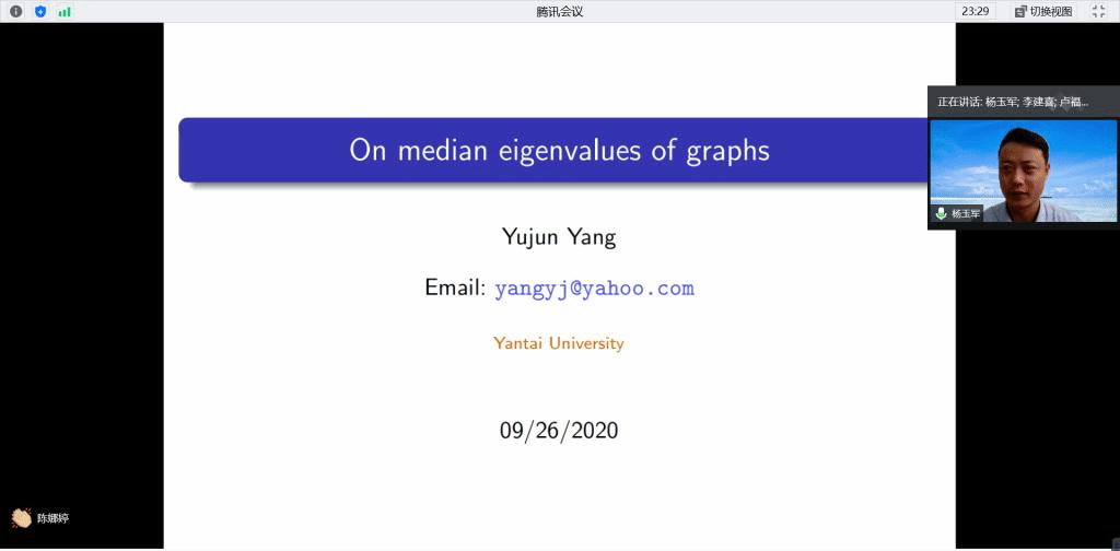 邀请,10月15日下午,烟台大学杨玉军教授在腾讯会议作了题为《Median eigenvaules of graphs》的报告。相关师生聆听了此次报告,报告由李建喜副院长主持。